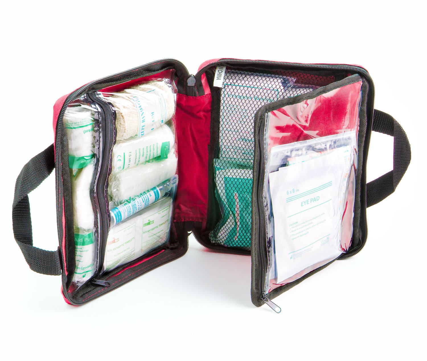 Include ghiaccio pronto uso, soluzione sterile per lavaggio oculare, coperta isotermica d'emergenza, garze, bende, cerotti per nocche e dita e altro ancora